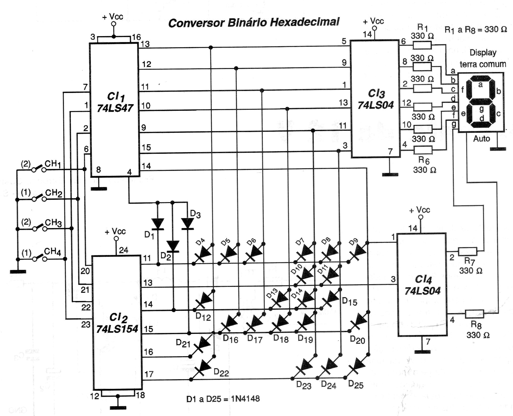 Este circuito de una publicación de 2001 convierte valores binarios programados en 4 llaves en valores hexadecimales presentados en un display de 7 segmentos de cátodo común. El circuito debe ser alimentado por 5 V ya que usa TTL, y los diodos admite equivalentes.