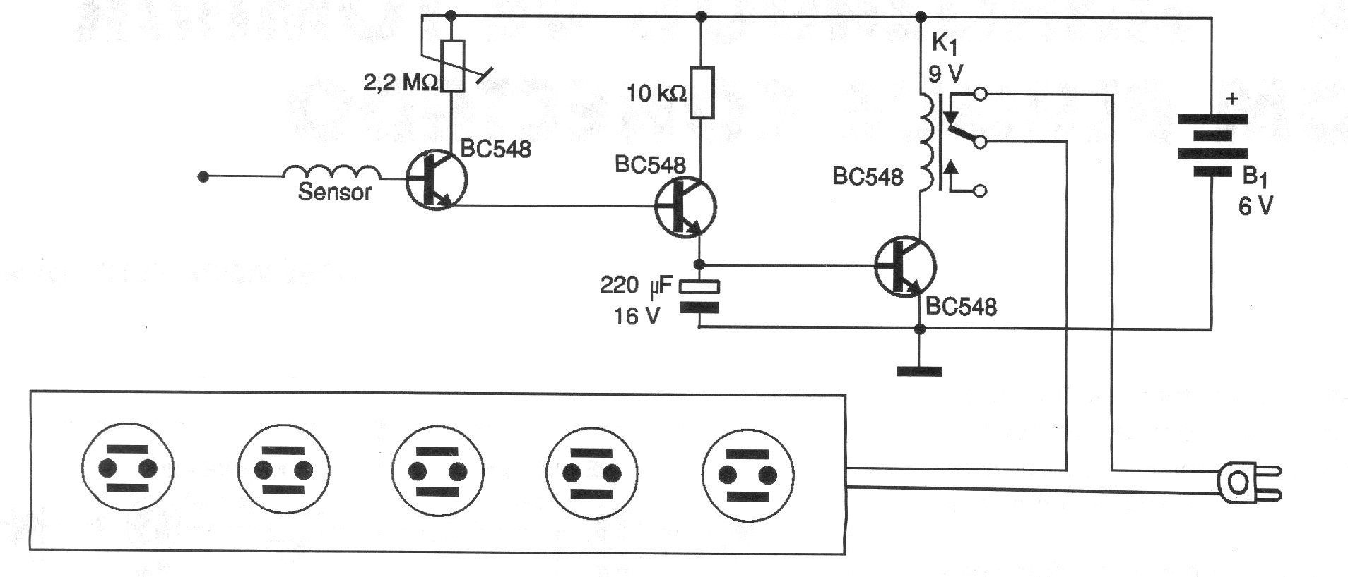 Encontramos este circuito en una documentación de 2002. Permite apagar los aparatos conectados a un conjunto de tomas por algunos segundos a partir de un toque en el sensor. El ajuste de la sensibilidad se realiza en el trimpot y el tiempo depende del condensador. El relé es del tipo sensible de 6 V.