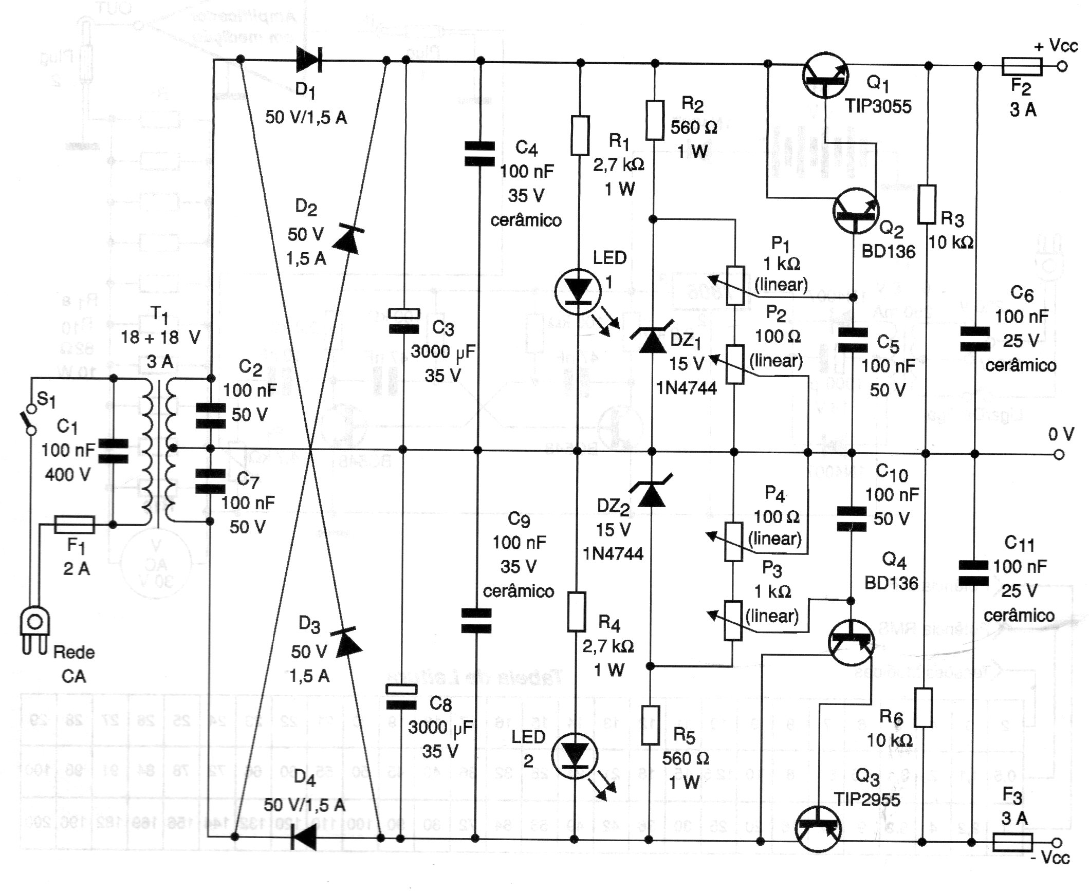 Esta fuente simétrica de buena potencia fue encontrada en una documentación de 2002. Los transistores de potencia deben estar dotados de buenos disipadores de calor y el potenciómetro de control P2 debe ser doble. Los otros potenciómetros hacen el ajuste fino de la salida. Los diodos pueden ser los 1N5402 o 1N5404.