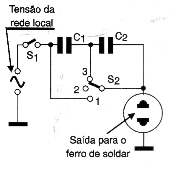 Este circuito se encuentra en una documentación de 2002. Lo que hace es colocar en una toma de potencia reducida para las planchas de soldar de 20 a 30 W. La reducción se realiza por capacitores de 2,2 uF o 3,3 uF con tensión de trabajo de 250 V o más si la red es de 110 V y de 400 V si la red es de 220 V.