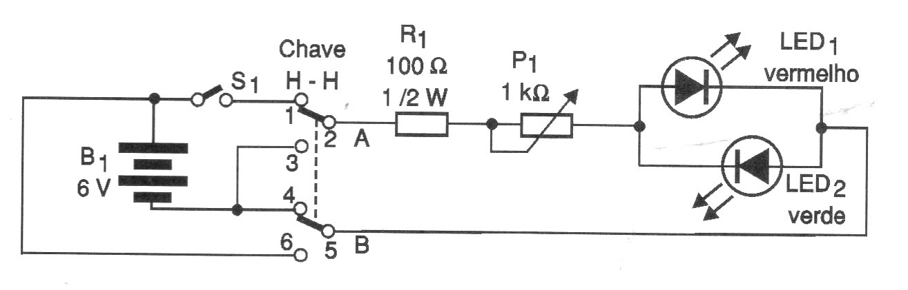 Este circuito se puede utilizar para mostrar el sentido de circulación de la cadena en semiconductores como, por ejemplo, LED. Con la corriente en un sentido, un LED se enciende e invierte el sentido a través de la llave, el otro LED se enciende. P1 controla el brillo.
