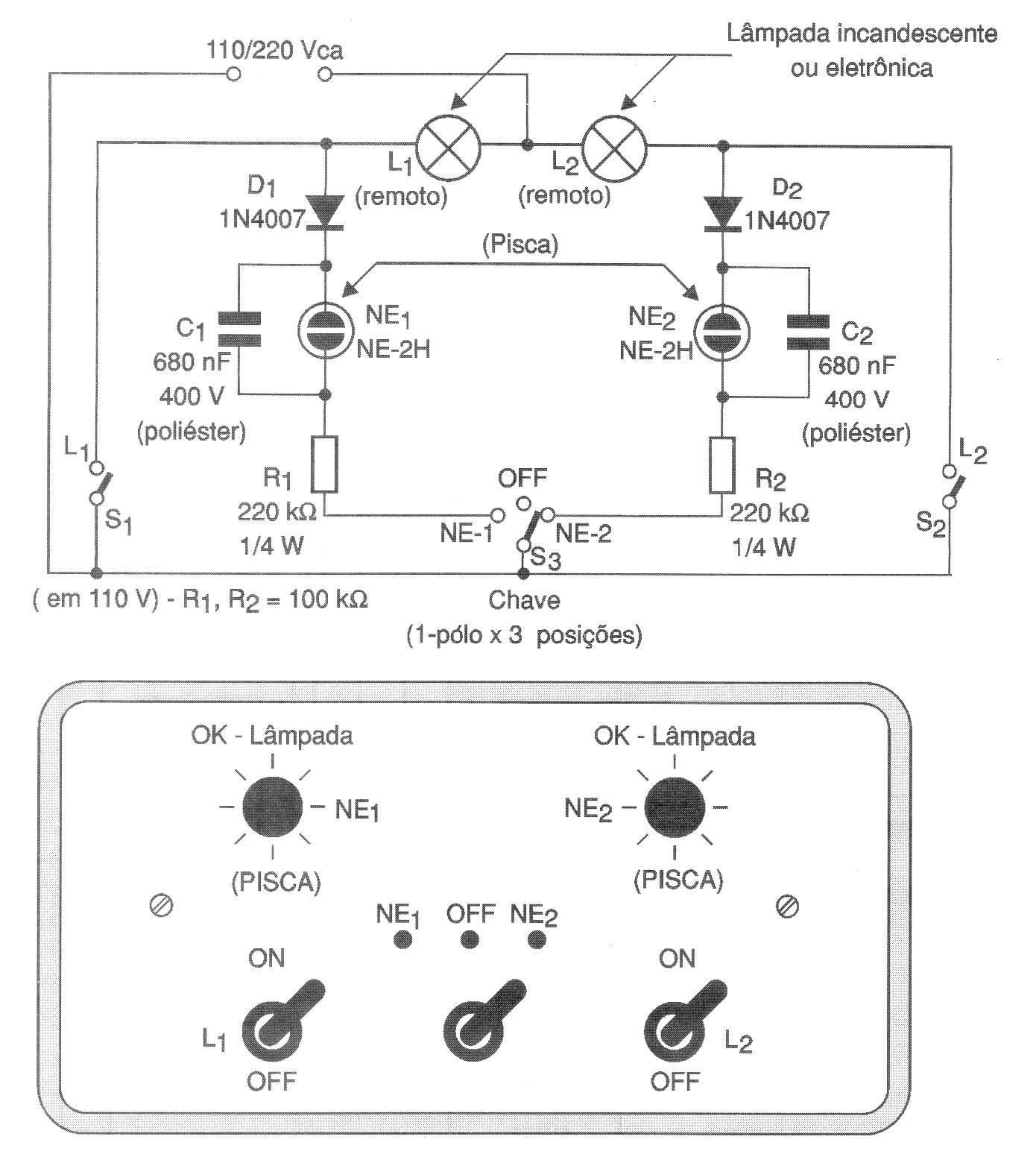 La finalidad de este circuito de 2002 es monitorear el funcionamiento de lámparas incandescentes comunes. Estas lámparas ya no se utilizan, pero el circuito puede adaptarse para monitorear otros tipos de cargas resistivas conectadas a la red de energía. El monitoreo se realiza a través de lámparas de neón.