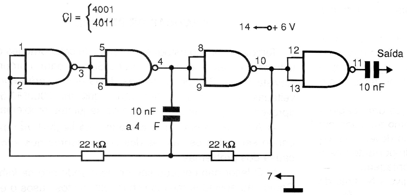Este circuito, que aparece en otros puntos de este sitio, puede ser elaborado tanto con el 4011 como 4001 y alimentado con tensiones de 3 a 12 V. La frecuencia depende del capacitor que puede ser alterado en una amplia gama de valores. La señal producida es rectangular rico en armónicos.