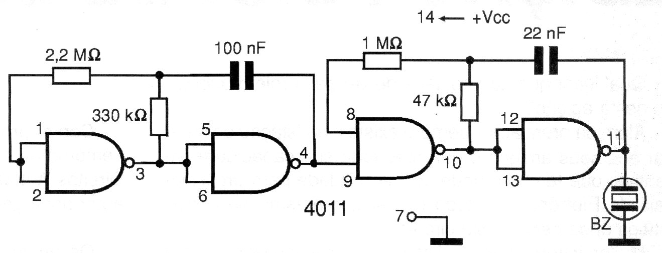 Esta configuración ya se ha utilizado varias veces en muchos de nuestros proyectos y se puede encontrar en esta sección de otras formas. El circuito es de una documentación de 2000 y la alimentación en los pines 14 y 7 se puede hacer con tensiones de 3 a 12 V.