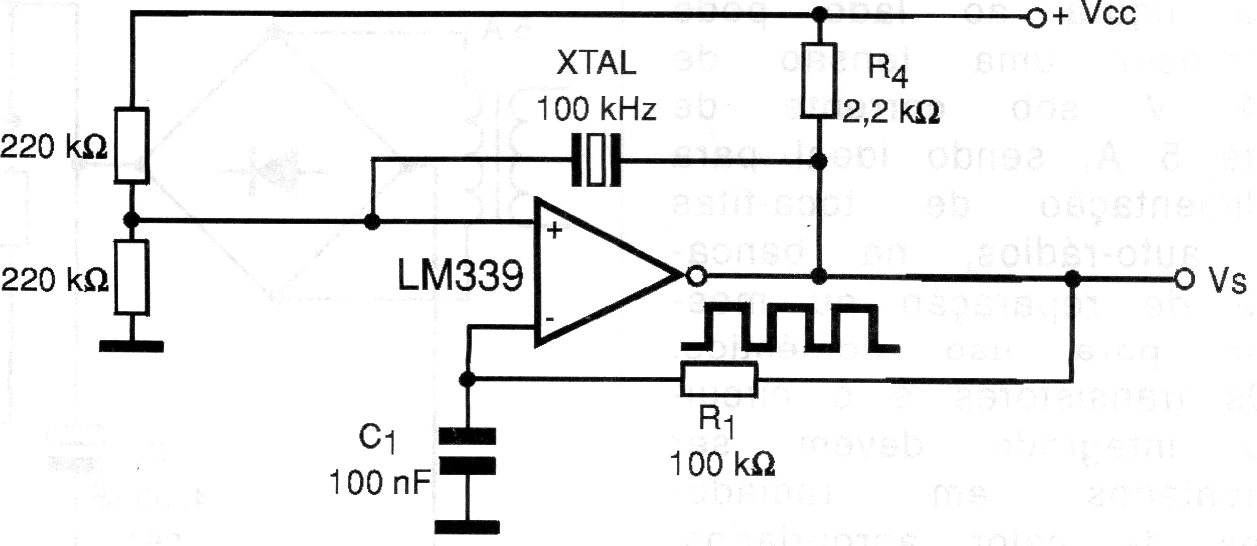 Esta configuración aparece varias veces en este sitio. El circuito puede generar una señal de 100 kHz o de otra frecuencia, según el cristal. La alimentación se puede hacer con tensiones de 5 a 12 V y sólo se utiliza uno de los comparadores del LM339.
