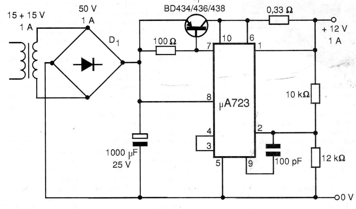 Esta fuente se basa en el circuito integrado 723, no más común en nuestros días. El transistor debe estar dotado de un disipador de calor y el puente puede estar formado por diodos 1N4002 o equivalentes.