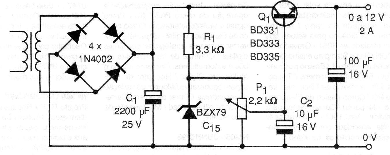 Esta fuente de 0 a 12 V utiliza sólo un transistor como reóstato y puede suministrar corrientes hasta 500 mA de acuerdo con el transformador. El transistor debe montarse en un disipador de calor. Para cadenas hasta 2 A utilice el TIP31. El transformador tiene un secundario de 12 V.