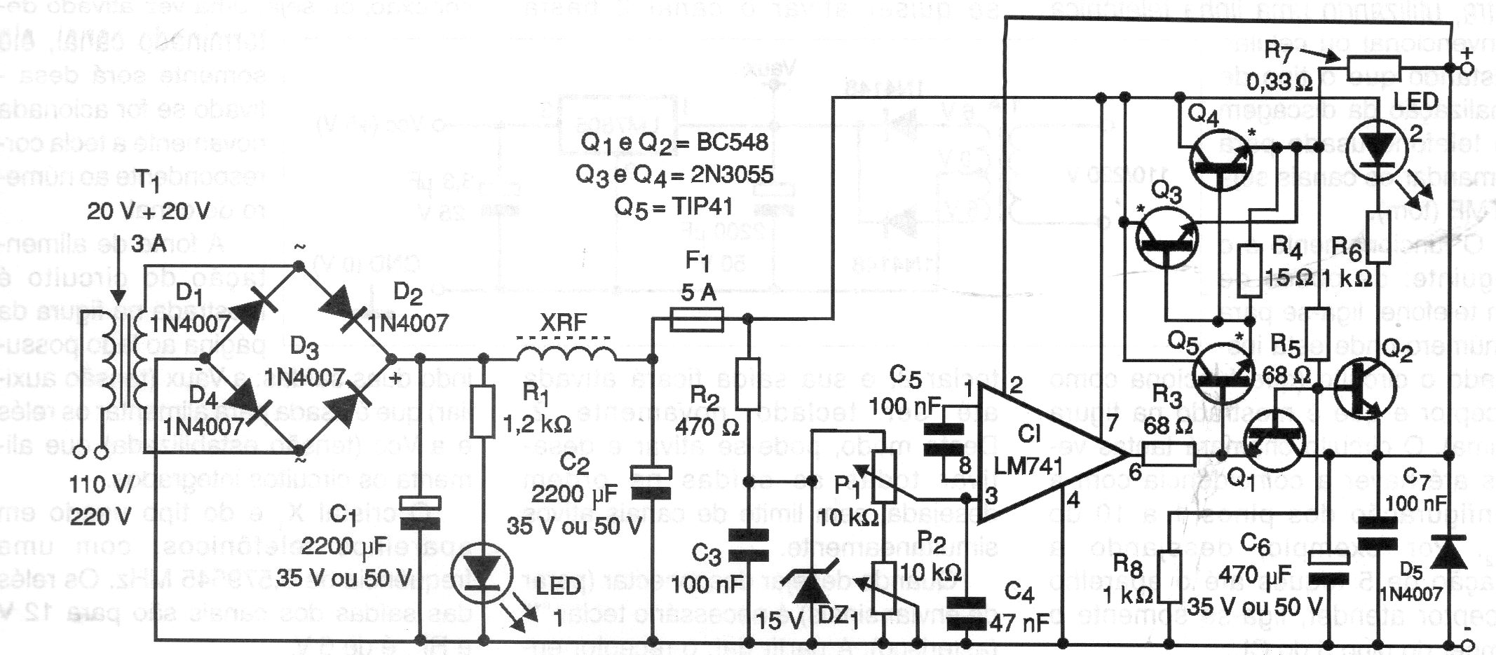 Encontramos este circuito en una publicación de 2000. Los transistores de potencia deben montarse en disipadores de calor. A pesar de los indicados 1N4007 en el circuito original, recomendamos el uso de los 1N5404 o 1N5407 para mayor corriente.