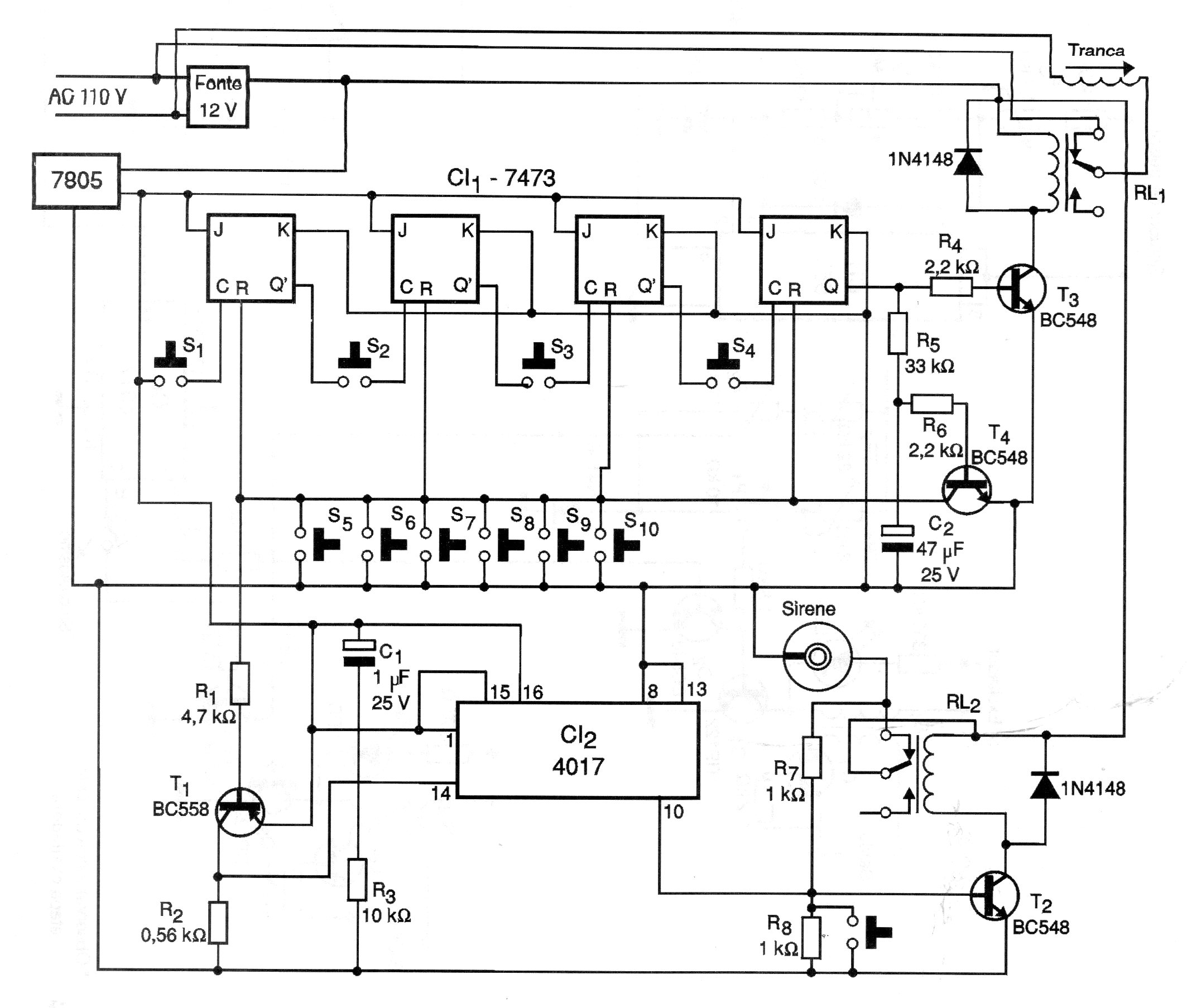 Encontramos este circuito en una documentación del año 2000. Debe ser alimentado por tensión de 5 V ya que utiliza circuitos integrados TTL. Para el sector de accionamiento del relé la alimentación es de 12 V, pues esta es la tensión de los relés utilizados. Los códigos se programan por las llaves de S1 a S4.