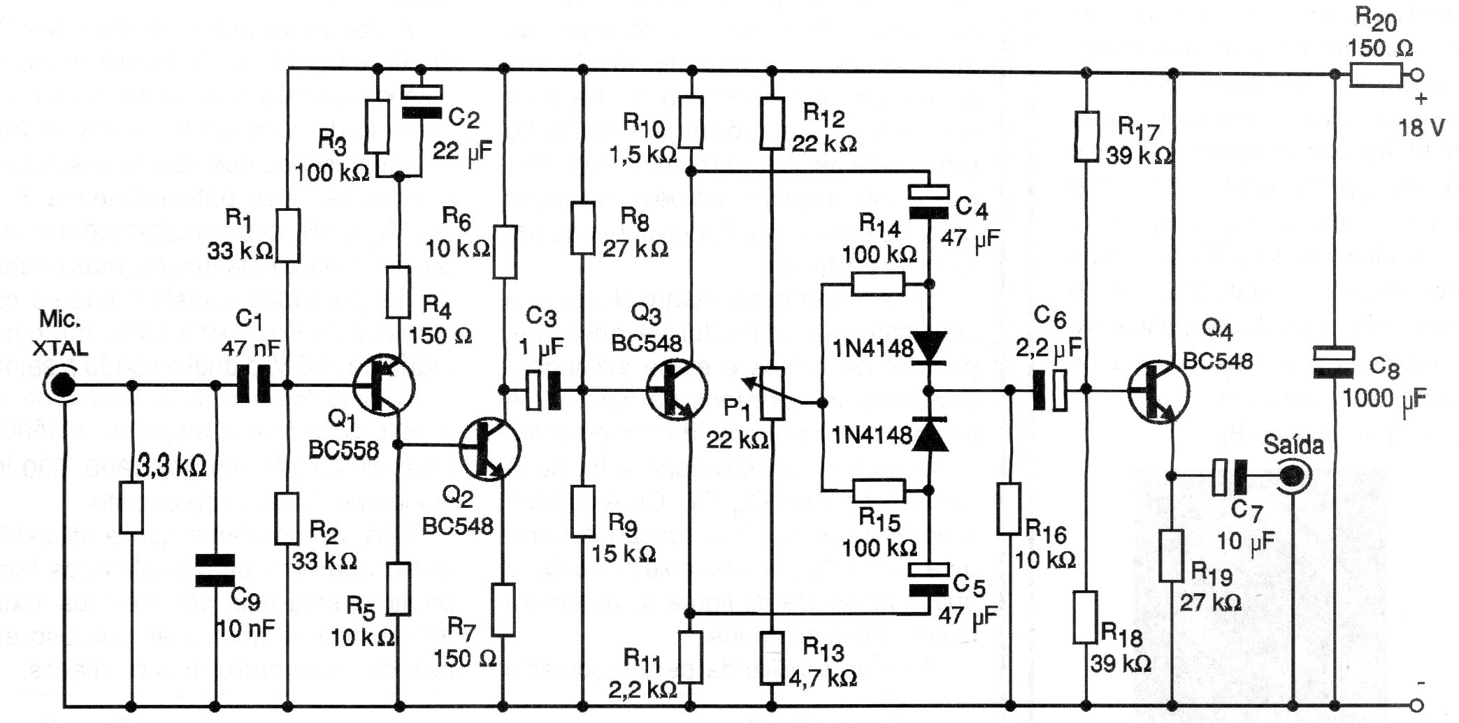 Este circuito de distorsión o voz de robot fue encontrado en una documentación del año 2000. El circuito opera con micrófono de cristal o piezoeléctrico de alta impedancia y el ajuste del punto de funcionamiento se realiza en P1. Los cables de entrada y salida de señal deben ser blindados.