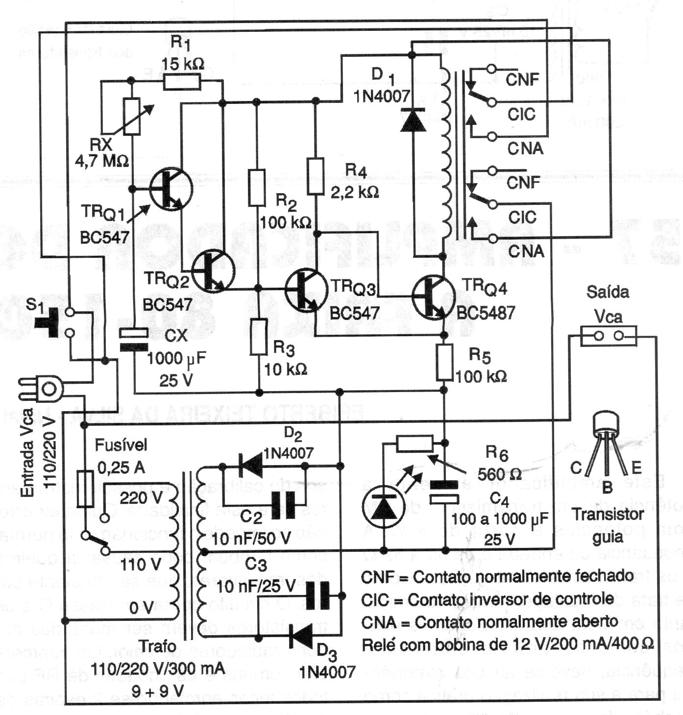 Este temporizador de hasta 2 horas se encontró en una documentación del año 2 000. Utiliza sólo transistores bipolares y, por lo tanto, de fácil montaje en nuestros días. El relé utilizado es de 9 V y se incluye la fuente. El circuito desconecta la fuente al final de la temporización.