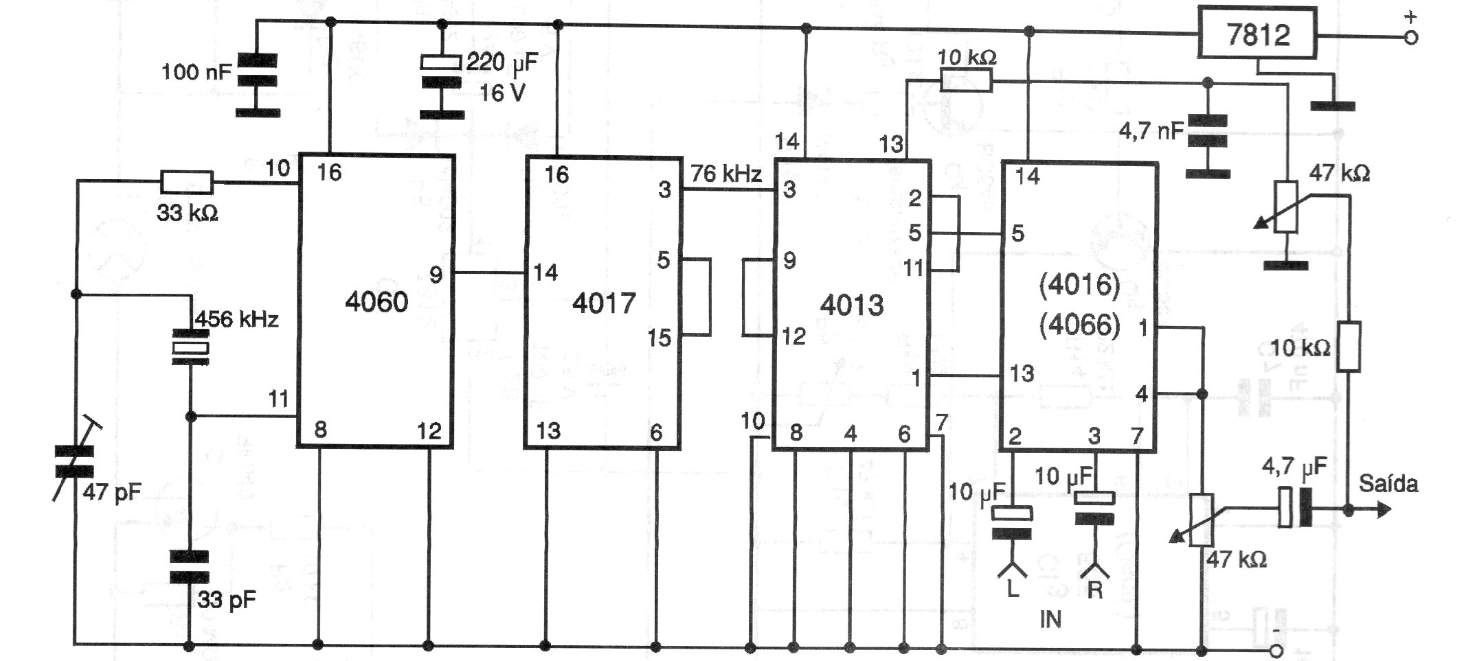 Este circuito codifica las señales de dos canales de un amplificador para una transmisión multiplex-estéreo. El circuito funciona con cualquier transmisor y las señales aplicadas son de pequeña intensidad, como los obtenidos en la salida de mezcladores y preamplificadores. La fuente de 15 V debe tener un excelente filtrado y el circuito incluye un regulador de 12 V.