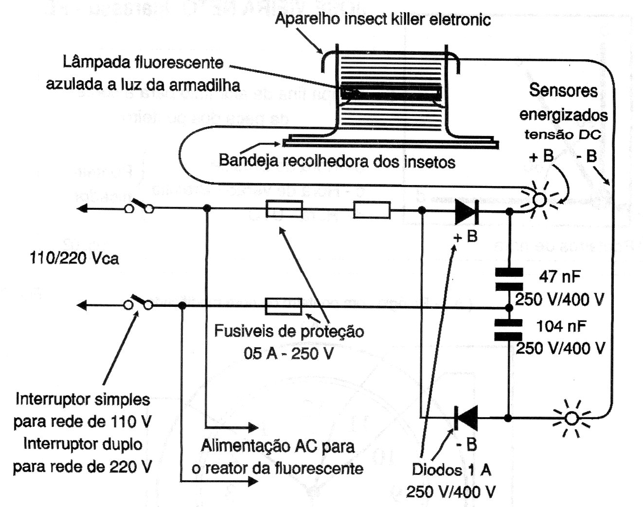 Este circuito, bastante actual por los problemas del aedes egypt, fue encontrado en una revista antigua. Se trata de una trampa ecológica que mata al insecto con una descarga eléctrica. El aparato es más indicado para el caso de insectos que son atraídos por la luz azul de una lámpara fluorescente.