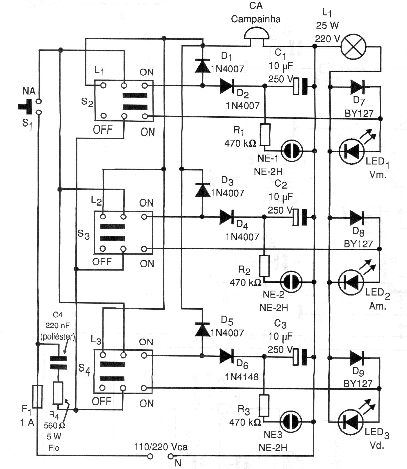 Acoplado a un timbre, este circuito del año 2000 proporciona una indicación para la atención, si la persona está ausente, espere y entre. El circuito es alimentado por la red de energía y la señalización es hecha por lámparas neon pulsantes.