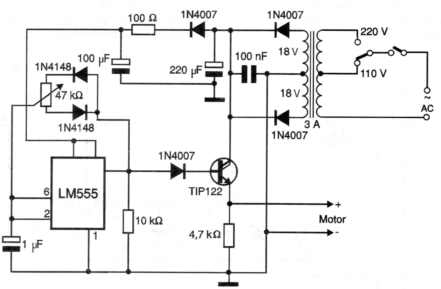 Este es uno de los muchos circuitos posibles de control PWM para un motor de corriente continua hasta unos 2 A. El circuito es de una documentación de 2000 siendo indicado para taladros tipo Dremel. El transistor de potencia debe montarse en un disipador de calor y el transformador tiene 18 + 18 V con 3 A.