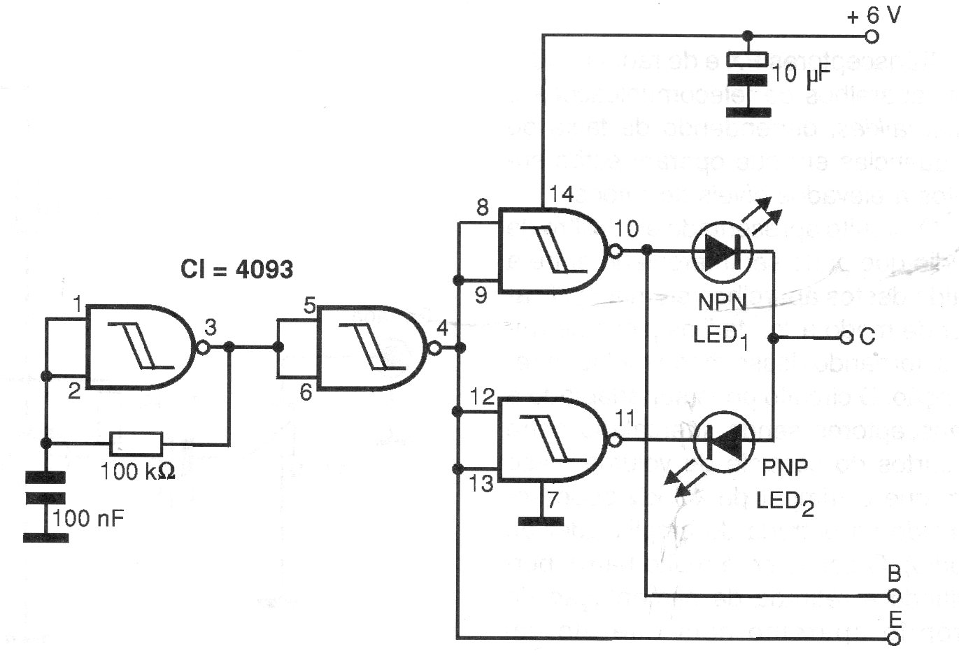 Diversas versiones de este tipo de prueba digital se han presentado en esta sección y en este sitio. Esta es otra que hace que los LED parpadeen alternativamente si el transistor en prueba está en buen estado. El circuito es de una documentación del año 2000.