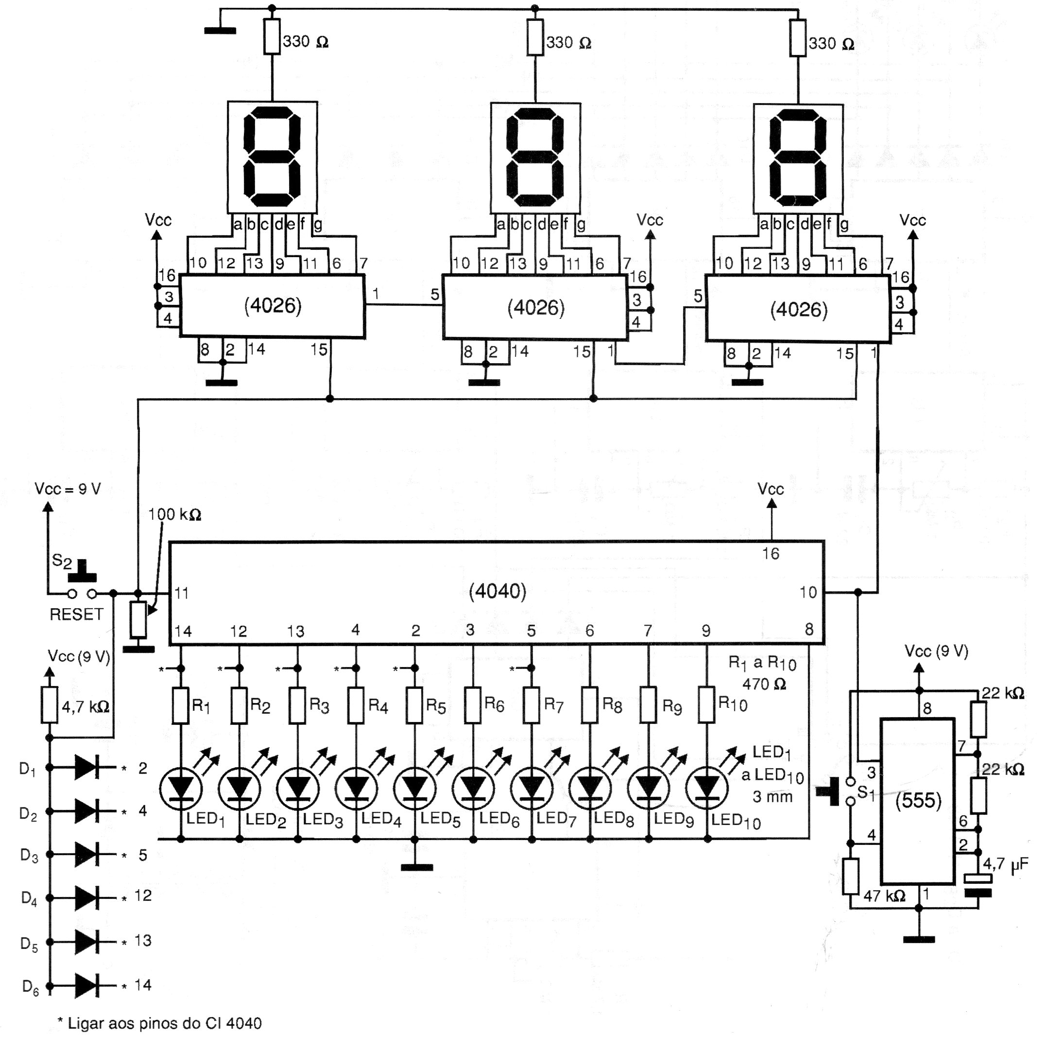 Este circuito además de hacer el conteo en decimal con presentación en 3 displays de 7 segmentos con cátodo común, también presenta el valor contado en binario a través de 10 LED. El circuito utiliza componentes comunes CMOS y puede ser alimentado por tensiones de 6 a 12 V.