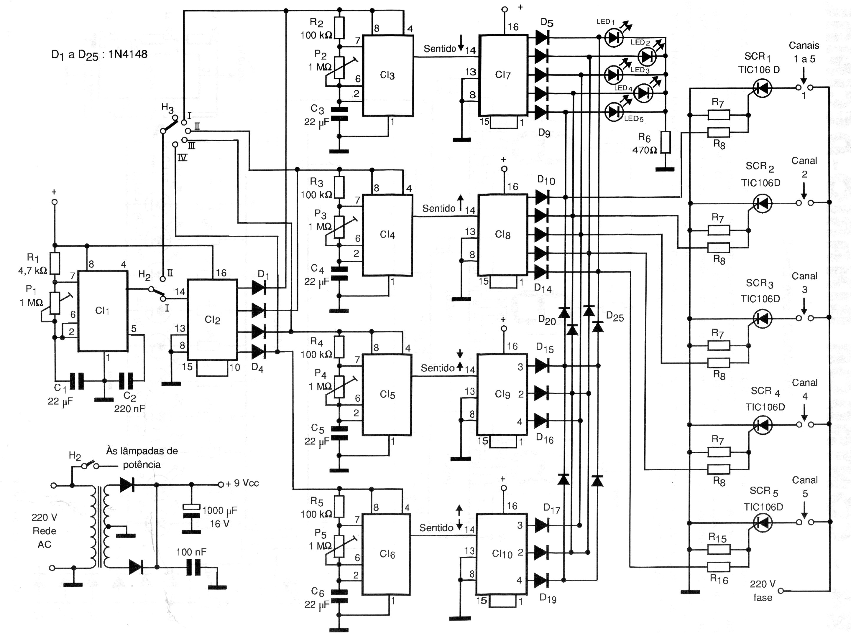 Este circuito de efectos para lámparas incandescentes con 5 canales se ha encontrado en una documentación de 2000. Los SCR deben estar dotados de disipadores de calor y otro tipo de lámpara no debe utilizarse a no ser los incandescentes. Los efectos se ajustan en potenciómetros o trimpots y hay varias opciones también seleccionadas a través de una llave.