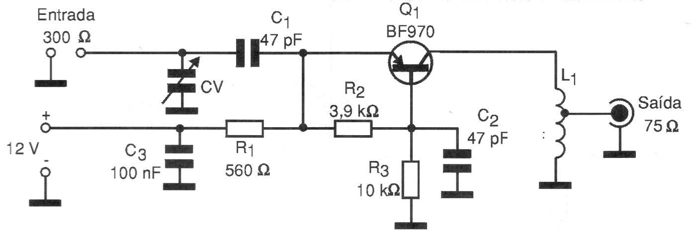 Este circuito debe ser alimentado por 12 V de fuente con corriente de 50 a 200 mA. El circuito amplifica señales en lugares de difícil recepción. La bobina L1 está formada por 11 espiras de hilo 24 o 26 en forma de 0,5 cm con núcleo de ferrita. La antena tiene un cable de 300 ohmios y para el receptor se utiliza un cable de 75 ohms.