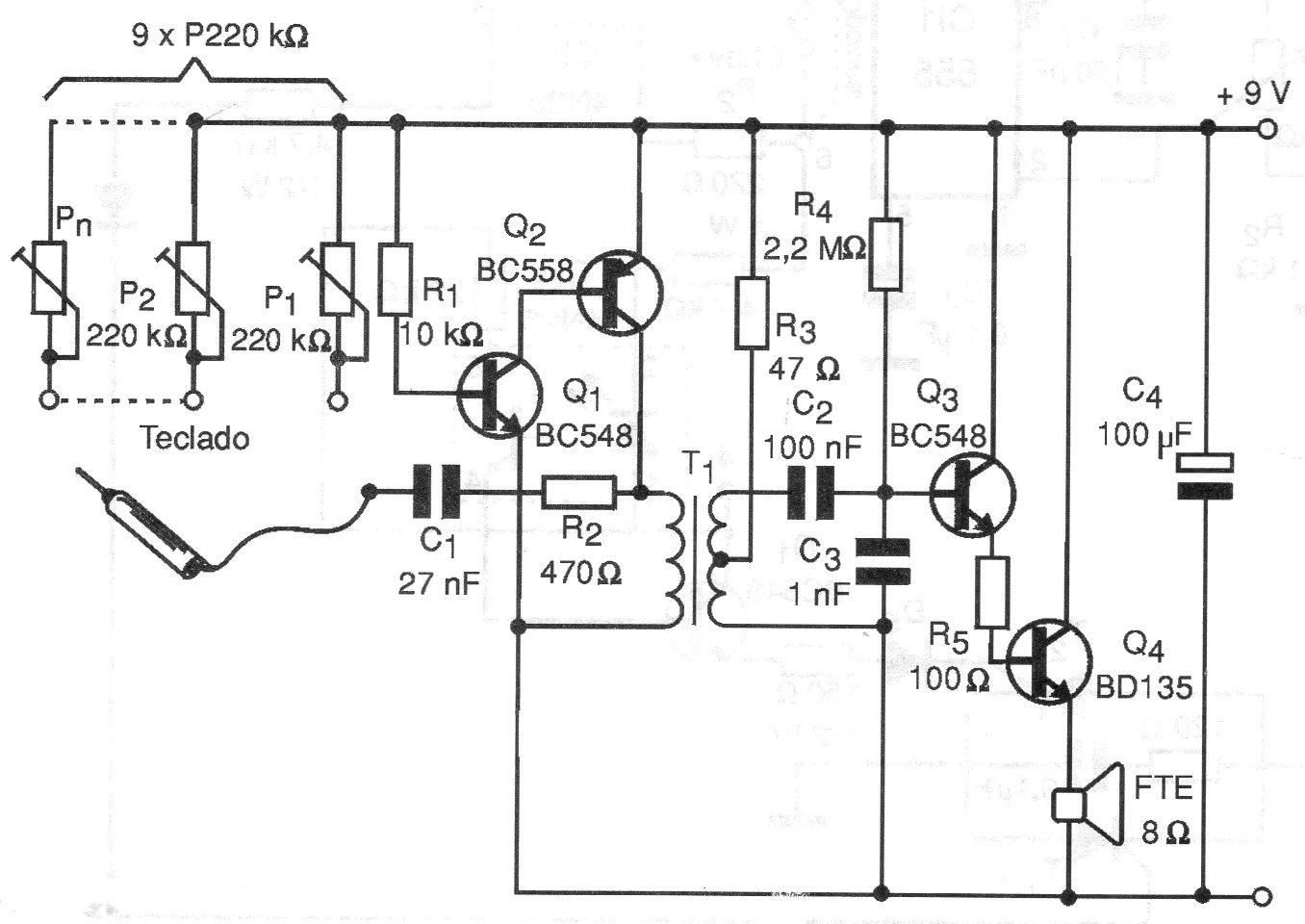 Este circuito de 2000 utiliza sólo transistores y un pequeño transformador de salida de radios transistorizado invertido. Las notas se afinan individualmente en los trimpots. El circuito es alimentado por 6 V de 4 pilas o 9 V de fuente o batería.