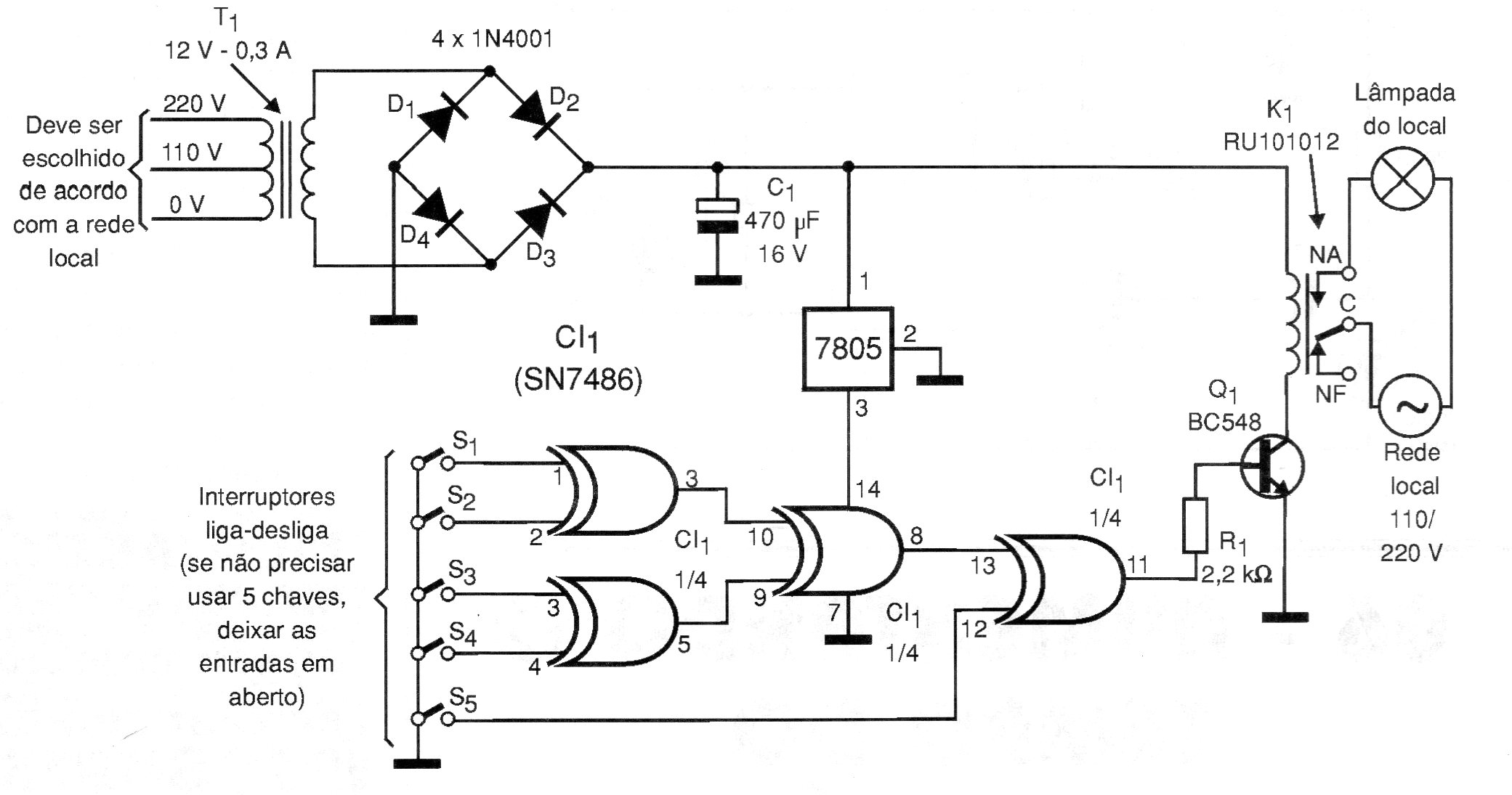 Este circuito permite controlar una lámpara a partir de 5 interruptores simples en lugares diferentes. El circuito utiliza relé de 12 V y configuración TTL lógica, que se ha encontrado en una documentación de 2000.