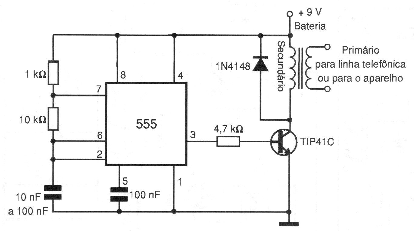 Lo que este circuito hace es simular el funcionamiento de una línea para verificar si el par trenzado hasta el receptor está sin interrupciones. Encontrado en una publicación del año 2000, él utiliza componentes absolutamente comunes pudiendo ser alimentado por pilas. El transformador tiene devanado primario de 220 V y secundario de 18 V x 100 mA.