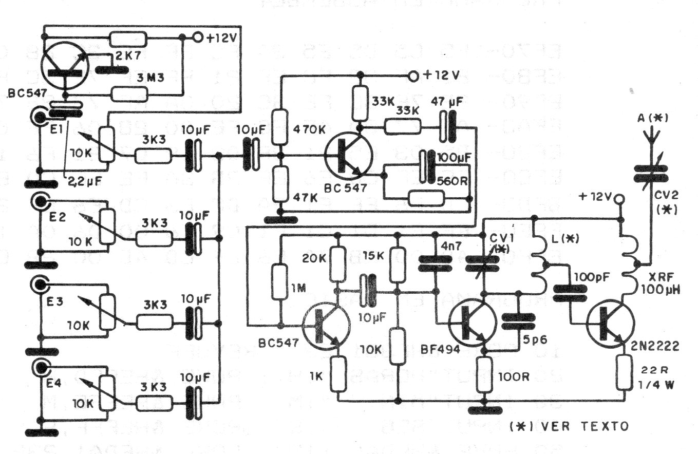 Este circuito de transmisor de FM incluye un mezclador de 4 entradas para ser utilizado como estación experimental. La bobina L tiene 4 espiras de hilo 18 o 18 en forma de 1 cm sin núcleo y XRF tiene 70 vueltas de hilo 32 en un resistor de 1M x ½ W. La alimentación de 12 V debe venir de fuente con excelente filtrado.
