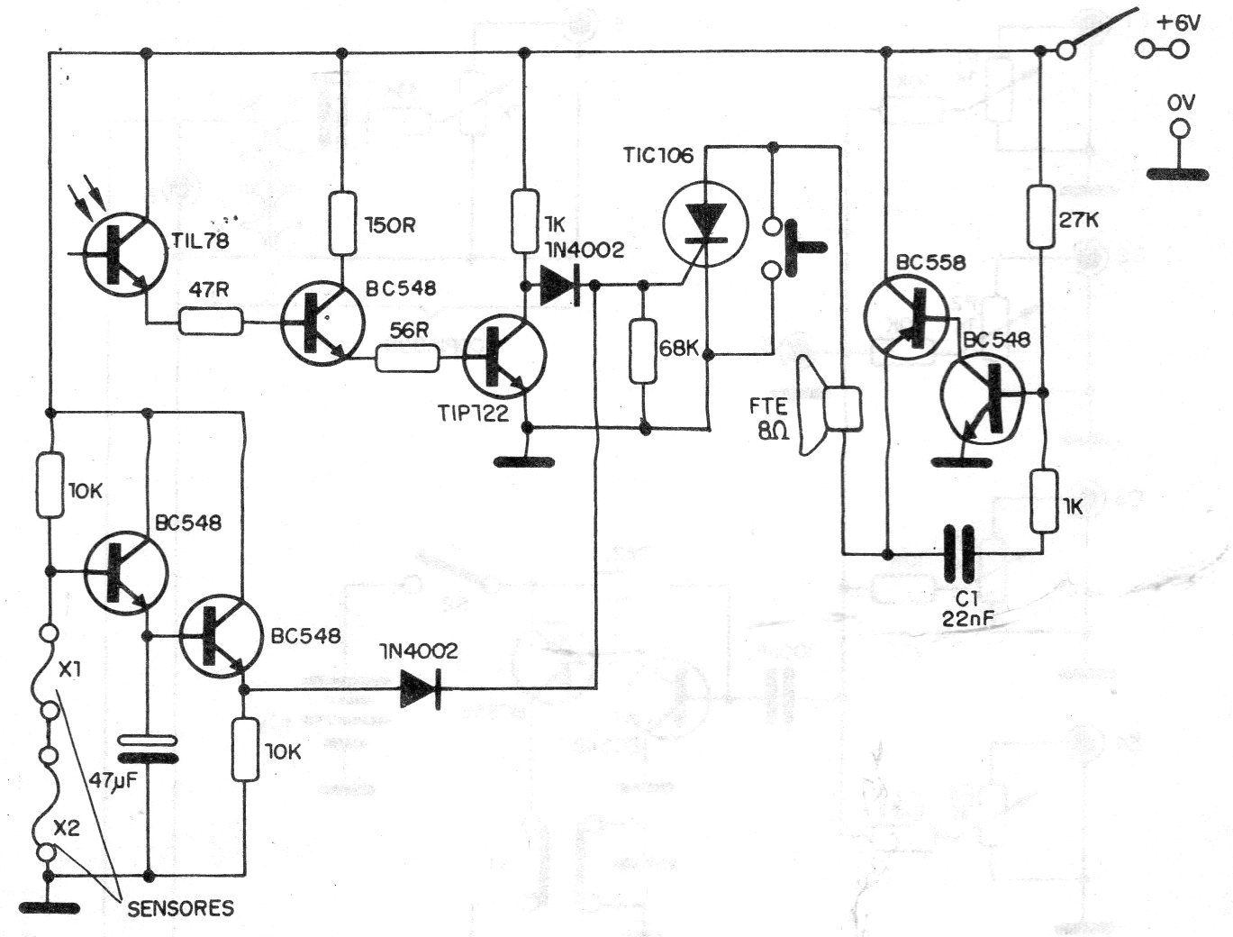 Esta alarma simple con sólo transistores se encontró en una publicación de 1990. Su alimentación se puede realizar por pilas grandes o batería y los sensores son de tipo de interrupción. Se pueden utilizar muchos más sensores en serie. El sonido del circuito al ser disparado depende del condensador C1 y para rearmar se presiona el interruptor en serie con el SCR.