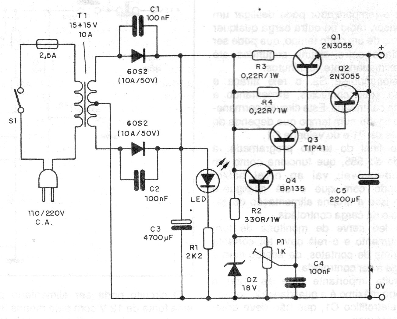 Esta fuente transistorizada fue encontrada en una documentación de 1990. Los transistores 2N3055 deben ser dotados de grandes disipadores y para el BD135 un disipador pequeño será suficiente. La fuente es ajustada por un potenciómetro y no tiene protección contra corto en la salida.