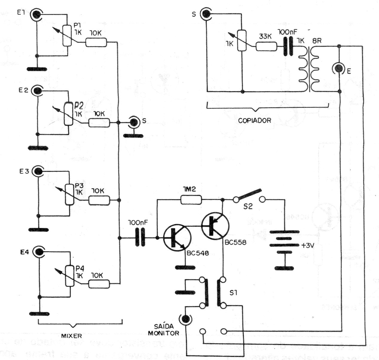 Este circuito consiste en realidad en un mezclador con algunos recursos adicionales, que se ha encontrado en una documentación de 1990. El circuito se alimenta con sólo dos pilas pequeñas y tiene un consumo muy bajo. Una de las salidas es amplificada, siendo usada con señales de poca intensidad.