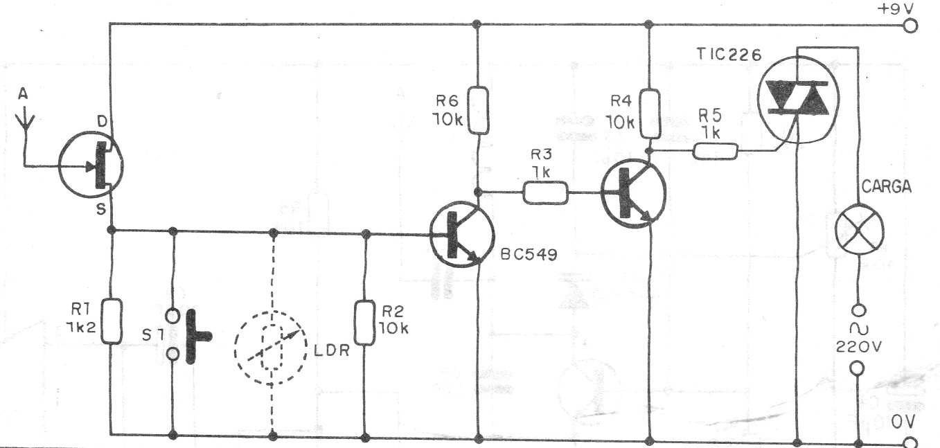 Esta llave de proximidad o relé de aproximación utiliza sólo transistores y controla directamente un Triac. El circuito es de 1990, pero todos los componentes son comunes, pudiendo el JFET ser un BF245 o MPF102. El triac debe estar dotado de disipador de calor y en el caso del control de una lámpara debe ser incandescente. Tenga cuidado de no tocar el sensor, ya que el circuito no está aislado de la red.