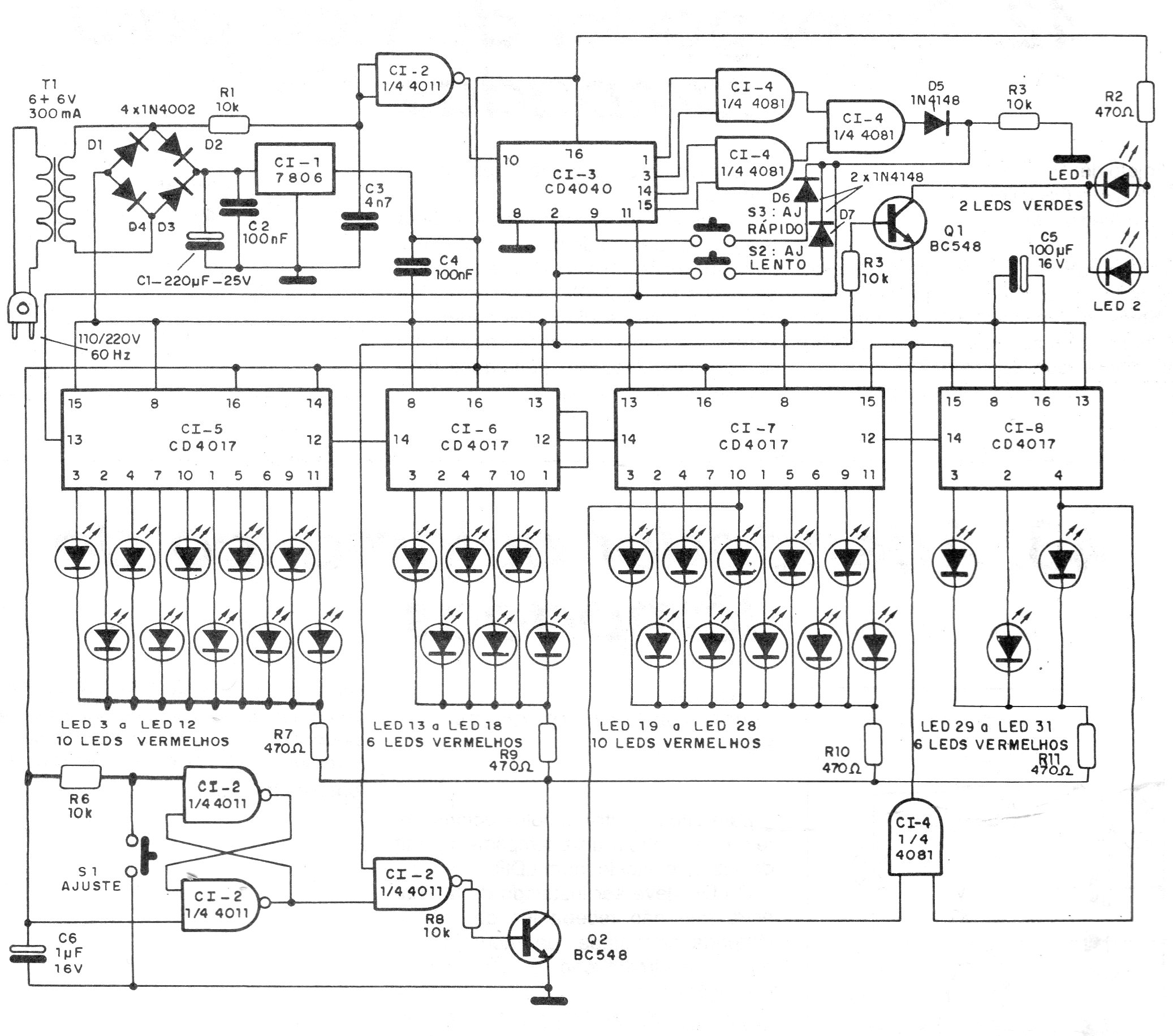 Este circuito de 1990 utiliza LEDs en un display con LEDs individuales que forman las horas y los minutos. El circuito se sincroniza con la frecuencia de la red de energía, lo que garantiza una buena precisión. Los componentes usados son CMOS todavía fáciles de encontrar en el mercado especializado. En la figura dada tenemos una idea de la esfera.