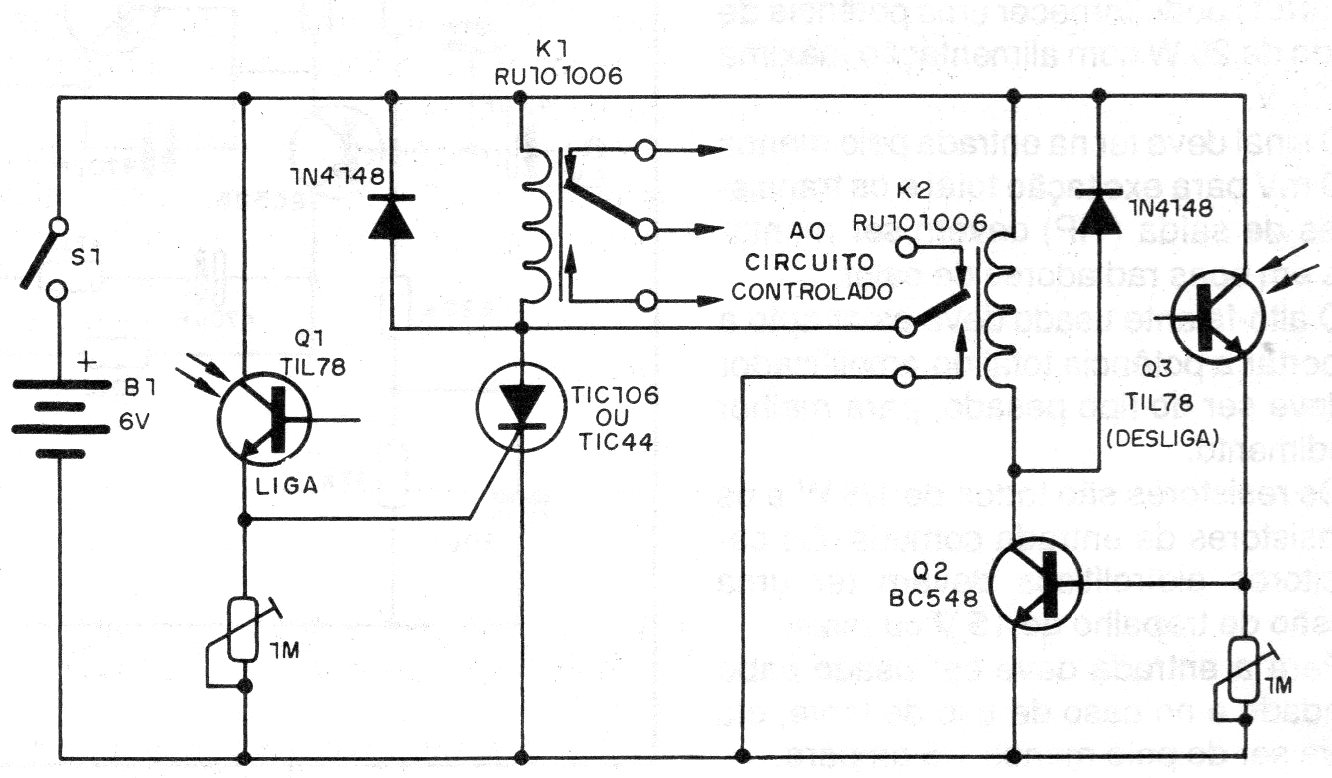Con un pulso de luz en el sensor Q1 el circuito se enciende y se bloquea. Para apagar es necesario enviar un pulso de luz al sensor Q2. Este circuito es alimentado por 6 V, pero el relé K1 debe ser de 5 V, pues hay una caída de tensión a ser compensada en su disparo, la cual ocurre en el SCR. El ajuste de sensibilidad se realiza en los trimpots.