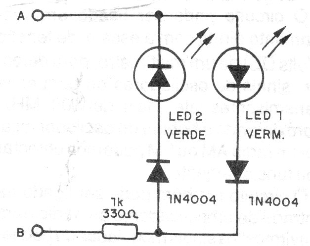 Este ultra simple indicador de polaridad utiliza LEDs comunes, verde y rojo y puede funcionar con fuentes de 3 a 9 V. Para tensiones mayores, aumente la resistencia para 1k (hasta 12V) y 1k5 para tensiones hasta 15 V. El circuito indicará que la la tensión se alterna con el encendido de los dos LED.
