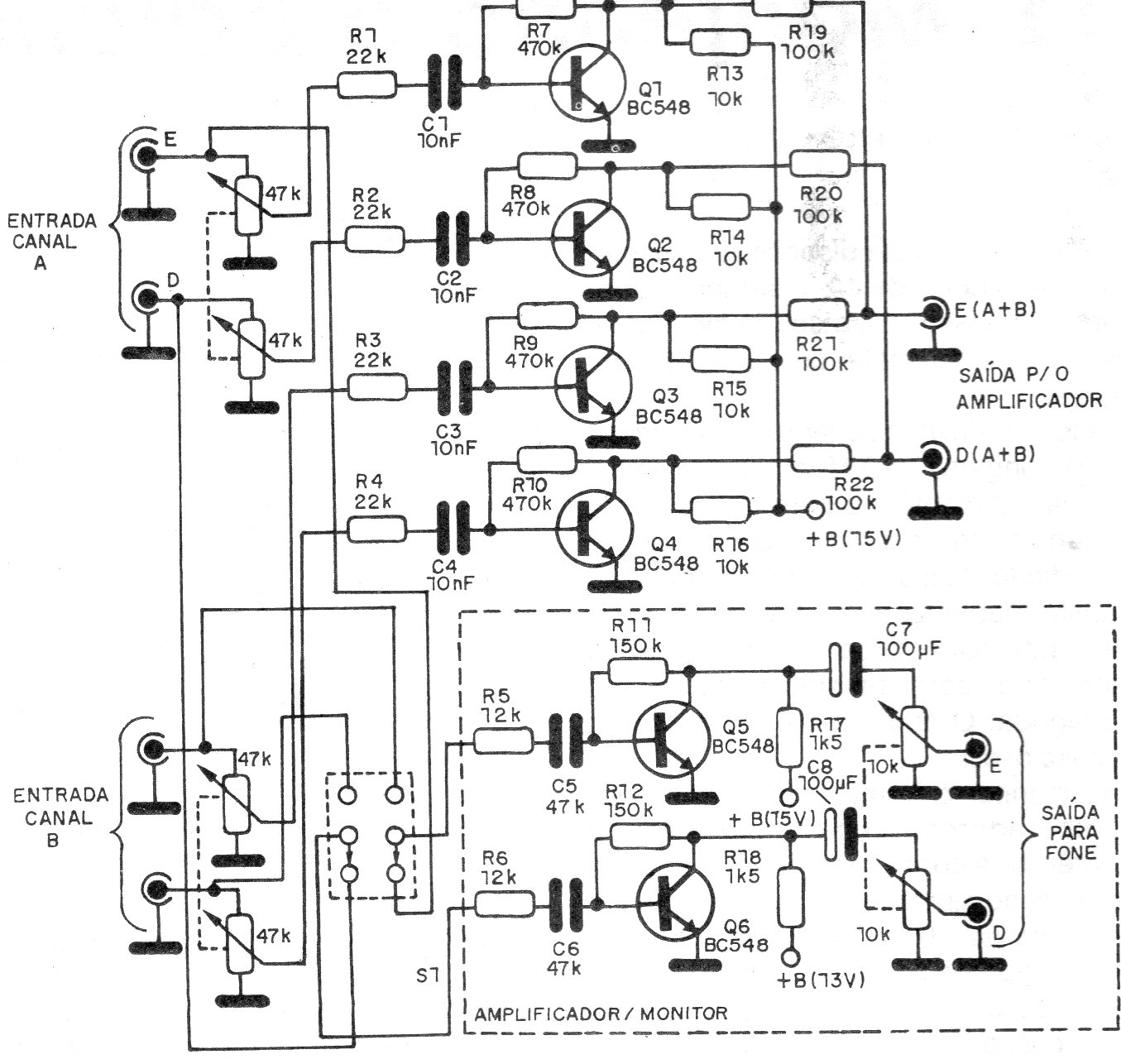 Este circuito con componentes discretos tradicionales fue encontrado en una documentación de 1990. El circuito puede ser alimentado por 6 o 12 V de fuente o pilas. Los cables de entrada y de salida deben ser blindados y se incluye salida para auriculares.