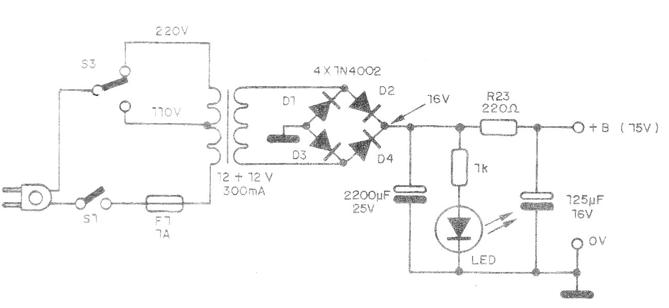 Esta fuente simple, sin regulación se indica para proyectos no críticos que exijan corrientes hasta 300 mA o poco más si el transformador es cambiado. El resistorR23 debe ser de 1 W por lo menos. El circuito está indicado para la alimentación del mezclador del CIR6183S.
