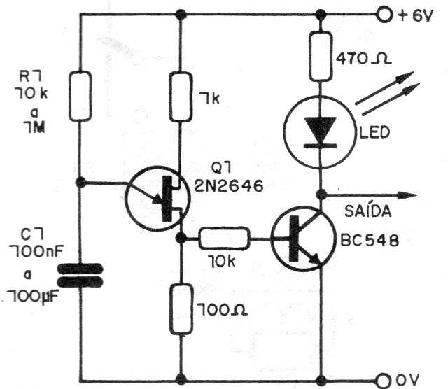Este circuito de una documentación de 1989 es más indicado para circuitos CMOS ya que funciona sólo con más de 6 V, dado el uso del transistor unijunción. Su frecuencia máxima es relativamente baja dependiendo de R1 y C1. El monitoreo del funcionamiento se realiza a través de LED.