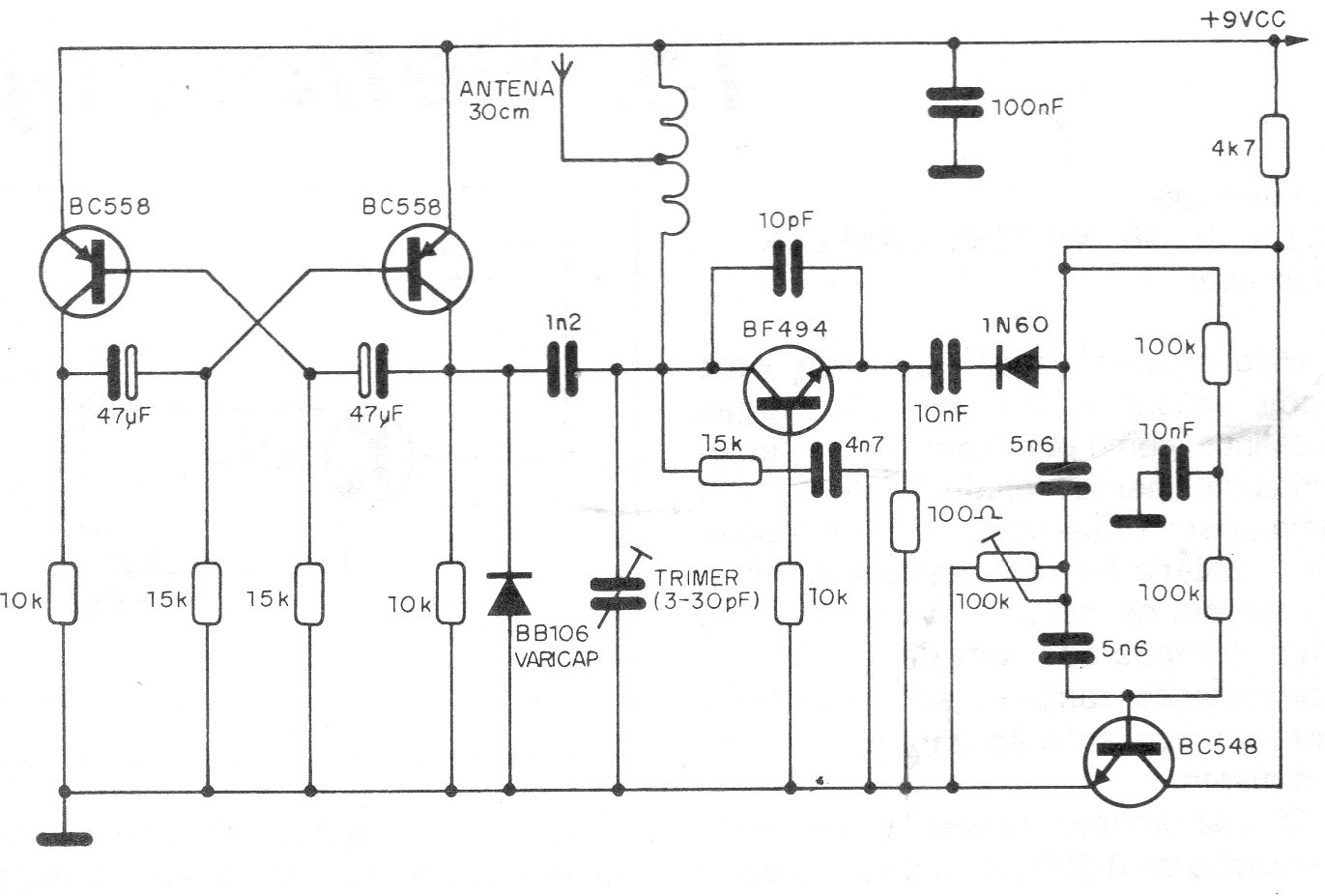 Encontramos este circuito en una publicación de 1989. Su finalidad es producir ruidos en la banda de VHF o UHF conforme la bobina del transmisor. Esta bobina puede ser de 1 +1 espiras a 3 + 3 espiras de hilo 26 o 28 en forma de 1 cm sin núcleo.