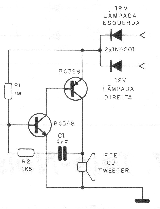 Este circuito añade un bip bip a los intermitentes parpadeantes que no poseen esta función. Una resistencia de 47 ohms a 470 ohms se puede conectar en serie con el altavoz para obtener un sonido de intensidad menor. La frecuencia puede ser cambiada por el cambio de valores de R1.