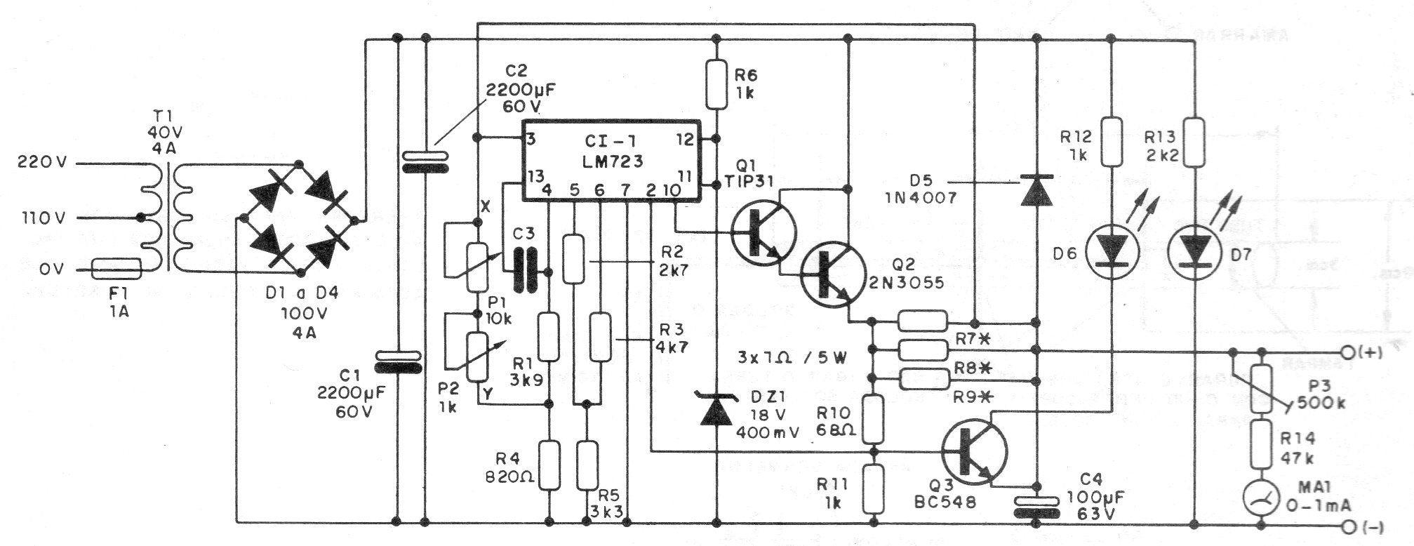 Encontramos esta fuente con el CI 723, común en la época, en una documentación de 1989. Los transistores de potencia deben estar dotados de disipadores de calor, principalmente el 2N3055. El circuito tiene un ajuste principal y un ajuste fino de tensión. El voltímetro en la salida puede ser sustituido por un multímetro común.