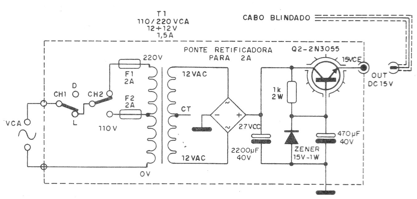 Esta fuente de 1,5 A para transmisores de FM fue indicada originalmente para el transmisor descrito en CIR6156S. El transistor regulador de tensión debe estar dotado de un disipador de calor y la conexión al transmisor debe realizarse por cable blindado. El puente utiliza diodos 1N4004 o se puede utilizar un puente completo para 1 o 1,5 A.