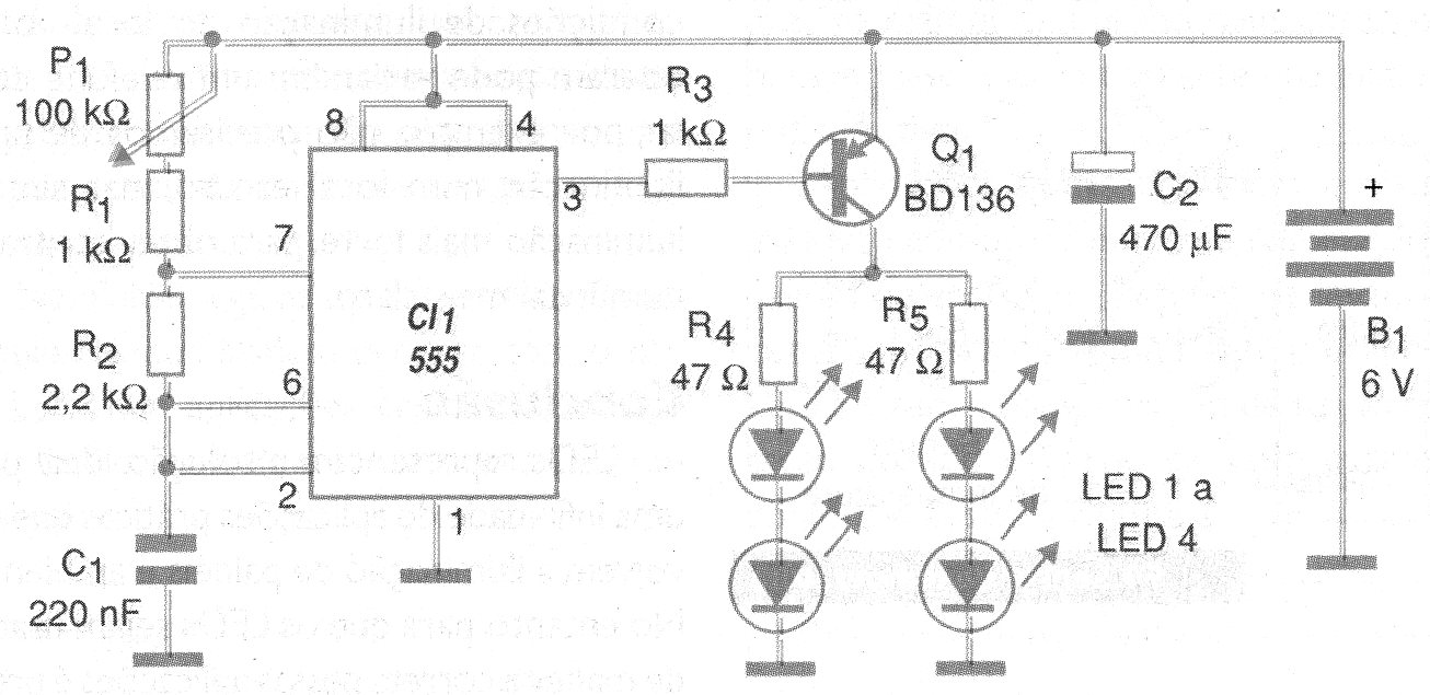 Con este simple circuito podemos controlar el brillo de un conjunto de LEDs de cualquier color a través de la modulación. El ajuste es hecho por P1 y la tensión de alimentación puede quedar entre 5 y 15 V. La resistencia en serie con los LED depende de la corriente máxima deseada.