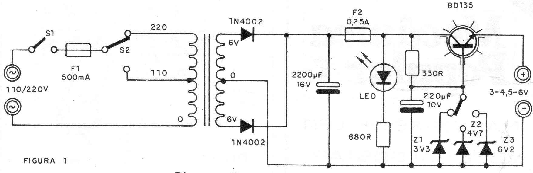 Este circuito de una documentación de 1986 proporciona tensiones de 3, 4, 5, 6 V bajo 350 mA para alimentación de walkmans y aparatos similares que usan pilas, El transistor de potencia debe estar dotado de disipador de calor y la selección de tensión se realiza por los zeners.