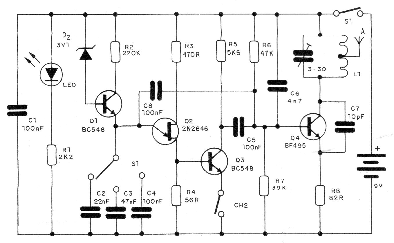 Este circuito, de 1989, genera barras horizontales en la pantalla de un televisor analógico antiguo. El circuito era indicado en la época para los ajustes de linealidad y altura de aquellos televisores. Las anchuras y separaciones de las barras fueron seleccionadas por la llave selectora con 3 condensadores. El circuito irradia directamente las señales al televisor. L1 tiene 5 espiras de hilo 24 o 26 en forma de 1 cm con toma central.