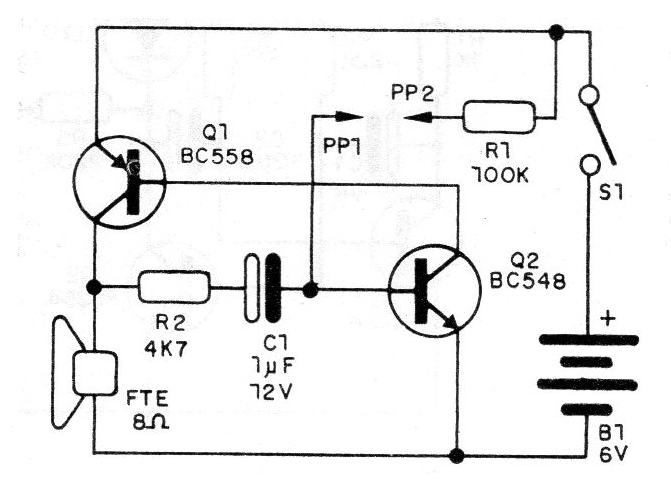 Este circuito consiste en una simple prueba de continuidad con dos transistores formando un oscilador de relajación. El circuito es alimentado por batería de 9 V o 4 pilas pequeñas y excita directamente un pequeño altavoz.