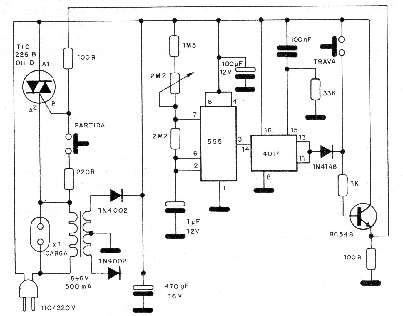 Este circuito fue encontrado en una documentación de 1989. El circuito controla directamente una carga de potencia por el uso de un triac. El tiempo es dado por el ajuste del potenciómetro que actúa sobre el 555. Los largos intervalos son obtenidos por el uso de un divisor por 10 con el 4017. El triac debe ser dotado de disipador de calor.