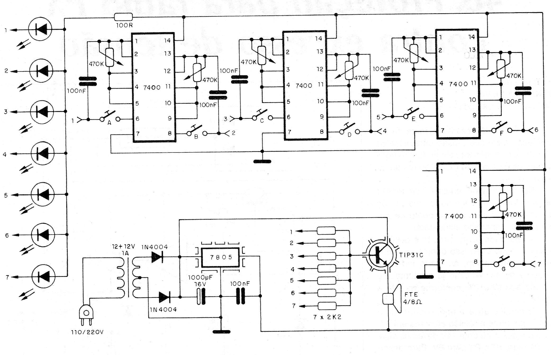 Encontramos este circuito en una publicación de 1986. Como él emplea circuitos TTL comunes, todavía se puede montar fácilmente. El circuito debe ser alimentado por 5 V de la fuente que se incluye y la señal de salida se aplica al pequeño amplificador ya existente o se puede aplicar a un amplificador externo.