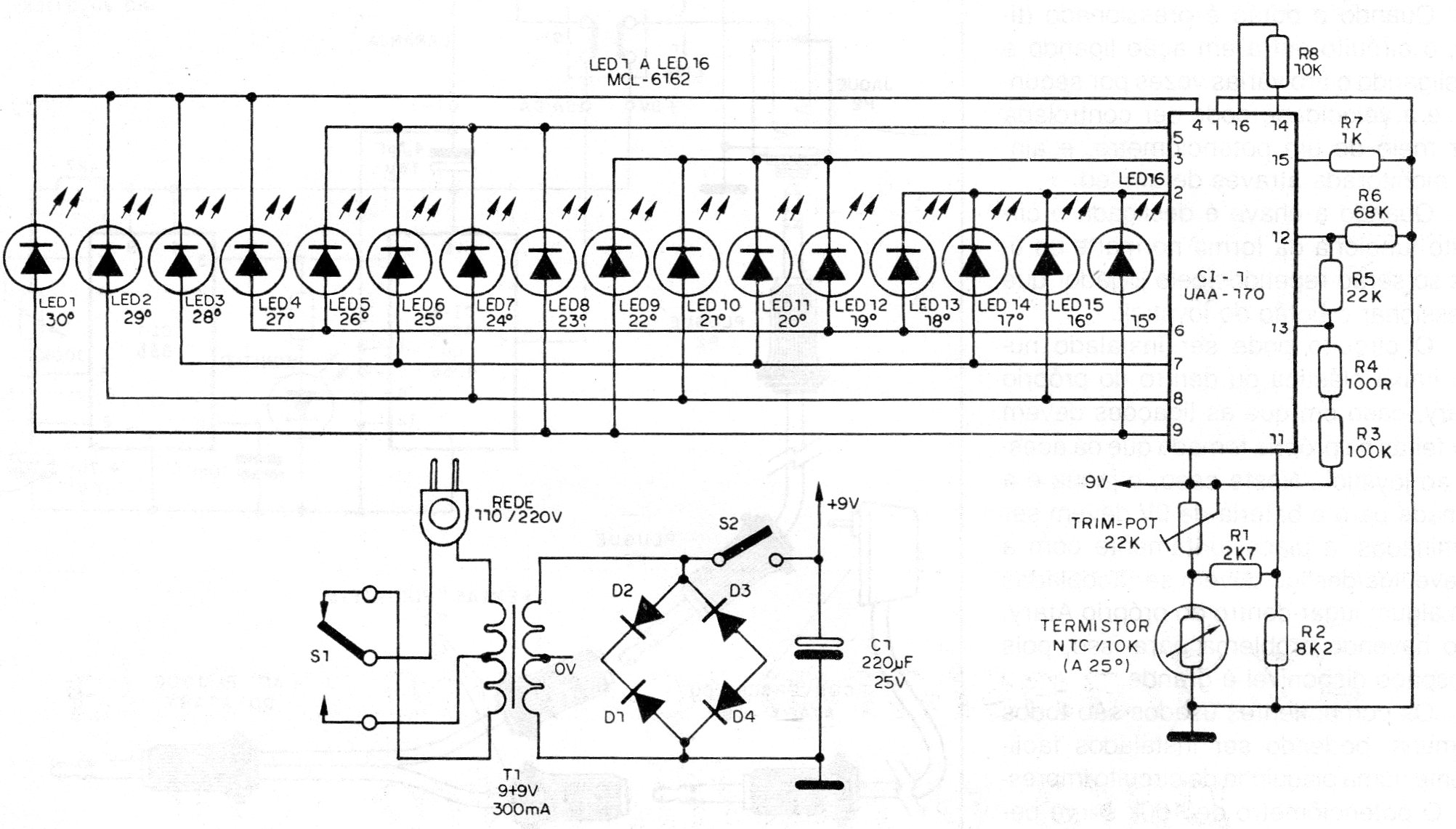 Este circuito, tipo bargraph, emplea un circuito integrado no muy común actualmente, pero puede ser adaptado para emplear un LM3914 que es más común en nuestros días. El circuito incluye una fuente de alimentación y el sensor es un termistor o NTC de 20 k. El ajuste de la escala se realiza en el trimpot.