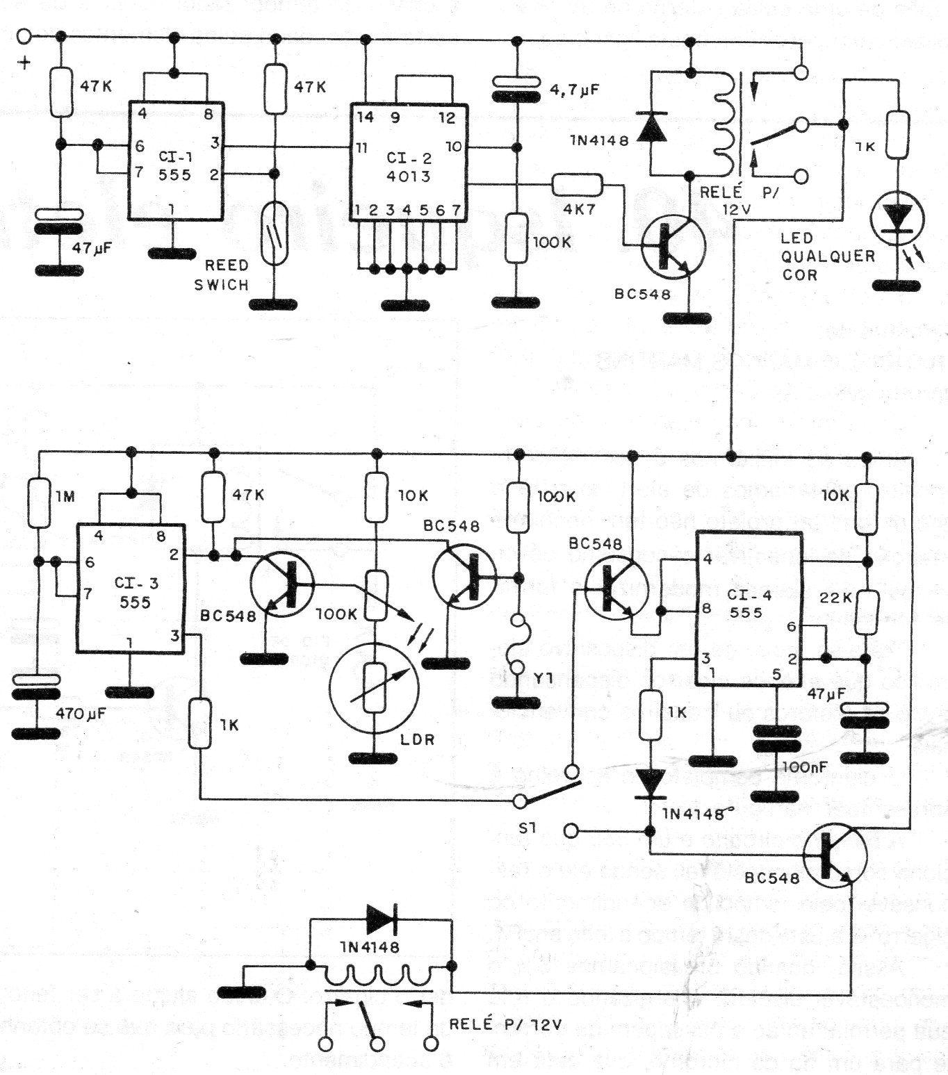 Encontramos este circuito en una documentación de 1986, pero él puede ser montado con facilidad aún hoy por los componentes que usa. El circuito tiene un sistema de temporización y actúa tanto con sensor óptico como con sensor de interrupción. Diversos sensores se pueden conectar en serie.