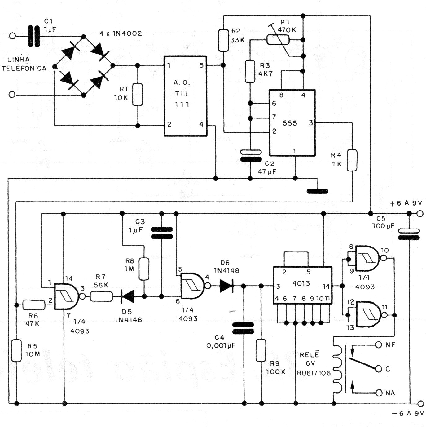 La idea básica de este circuito de 1989 es accionar un relé por un cierto tiempo cuando una señal de llamada se produce en una línea telefónica. Así, esta señal puede ser usada para accionar una lámpara u otro dispositivo de la casa dando la impresión de la presencia de alguien. El circuito está indicado para que el propio propietario llame a su casa en su ausencia, y así simule su presencia.